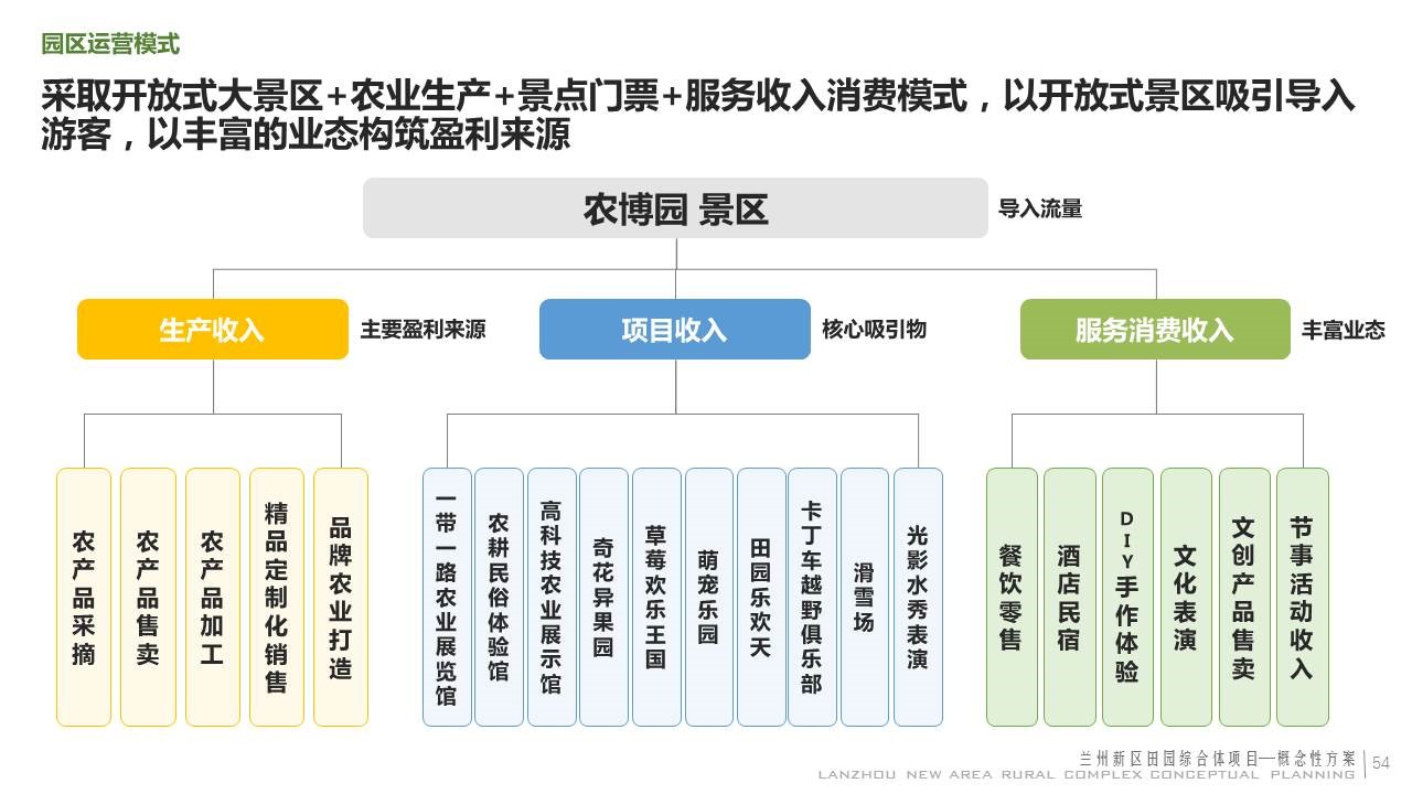 智慧農(nóng)業(yè)科技+生產(chǎn)性博覽,實(shí)現(xiàn)園區(qū)健康運(yùn)營(yíng):項(xiàng)目通過農(nóng)業(yè)博覽、一帶一路文化及農(nóng)業(yè)科技展示、田園休閑旅游塑造了整個(gè)片區(qū)的復(fù)合吸引力。農(nóng)博園將全域?qū)胫腔坜r(nóng)業(yè)科技的概念,未來該區(qū)域不僅僅是設(shè)施農(nóng)業(yè)的展示,也將形成寒旱地區(qū)特有的溫室育種、種植、采摘體驗(yàn)等一系列的服務(wù)。園區(qū)的生產(chǎn)性收入、經(jīng)營(yíng)性收入、及旅游服務(wù)收入占比均衡,即使在游客量較少的季節(jié),也可以通過農(nóng)業(yè)產(chǎn)品及上下游產(chǎn)業(yè)實(shí)現(xiàn)園區(qū)運(yùn)營(yíng)的自給自足。