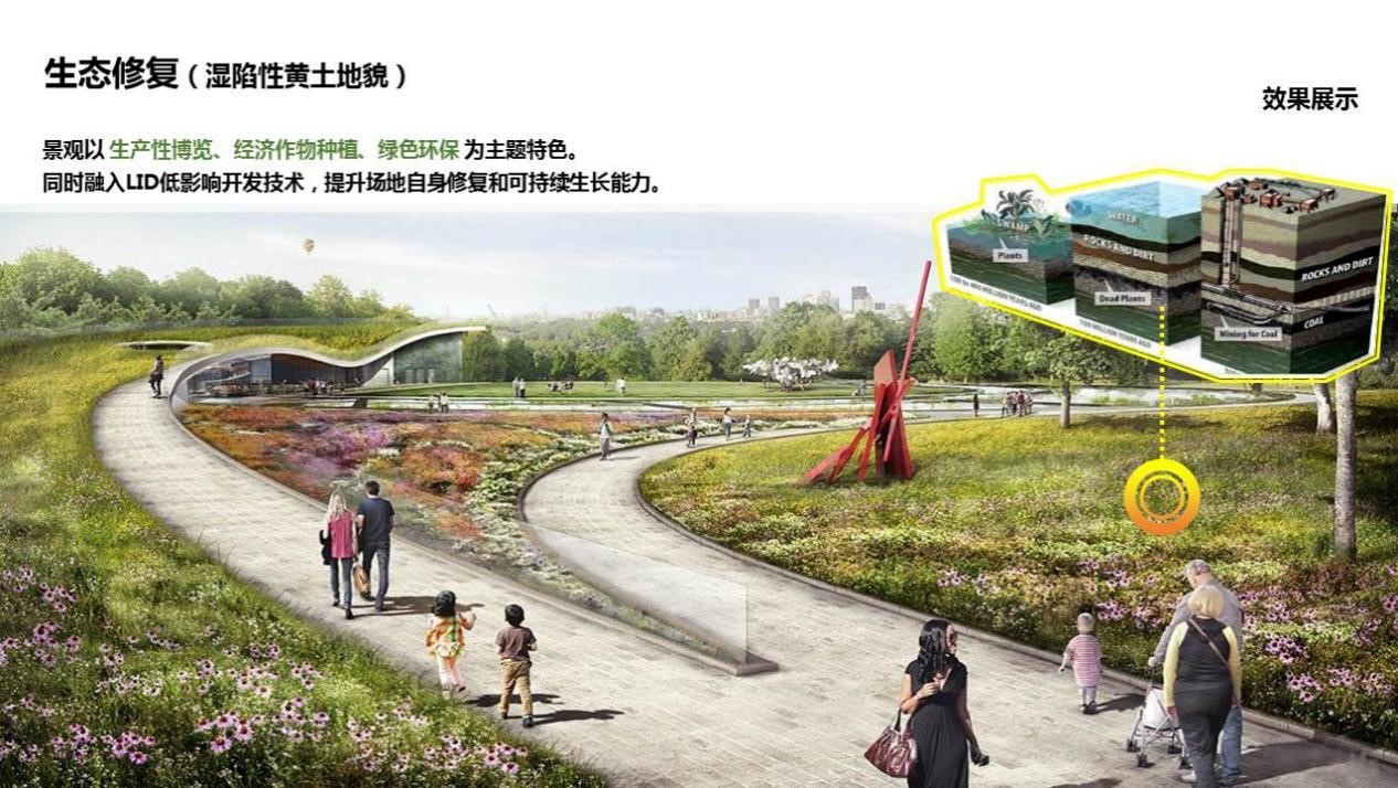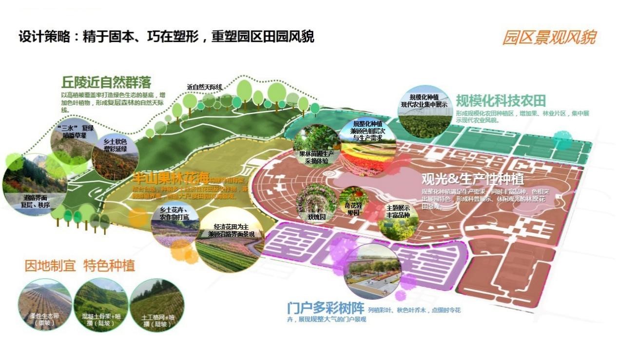 溝壑地貌、濕陷性黃土上的生態(tài)修復(fù):項(xiàng)目區(qū)域降水較少,地表水資源貧乏,植被稀疏,植物群落簡(jiǎn)單。在新區(qū)生態(tài)文明與鄉(xiāng)村振興政策的背景下,農(nóng)業(yè)公園進(jìn)行了大規(guī)模的綠化造林、草原農(nóng)田保護(hù)、區(qū)域環(huán)境重塑等生態(tài)修復(fù)的工作。景觀以生產(chǎn)性博覽、經(jīng)濟(jì)作物種植、綠色環(huán)保為主題特色,同時(shí)融入LID低影響開發(fā)技術(shù),提升場(chǎng)地自身修復(fù)和可持續(xù)生長(zhǎng)能力。