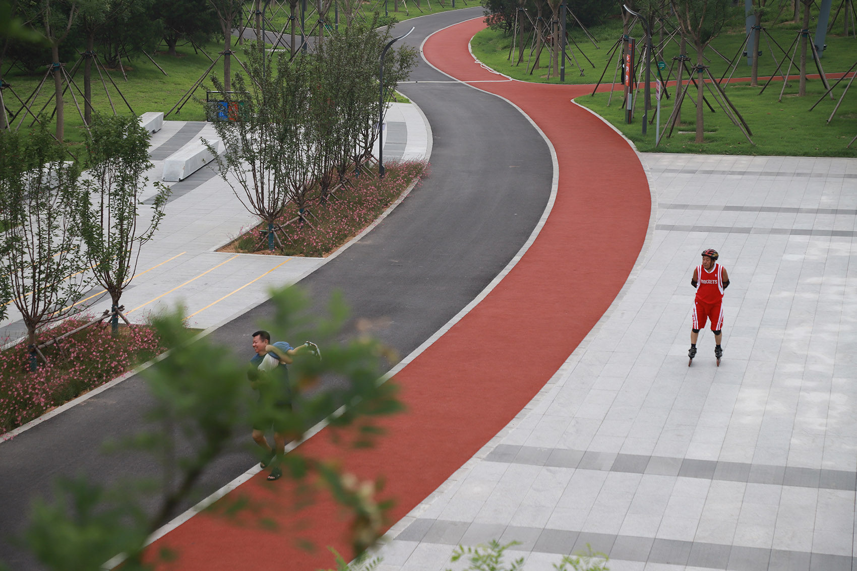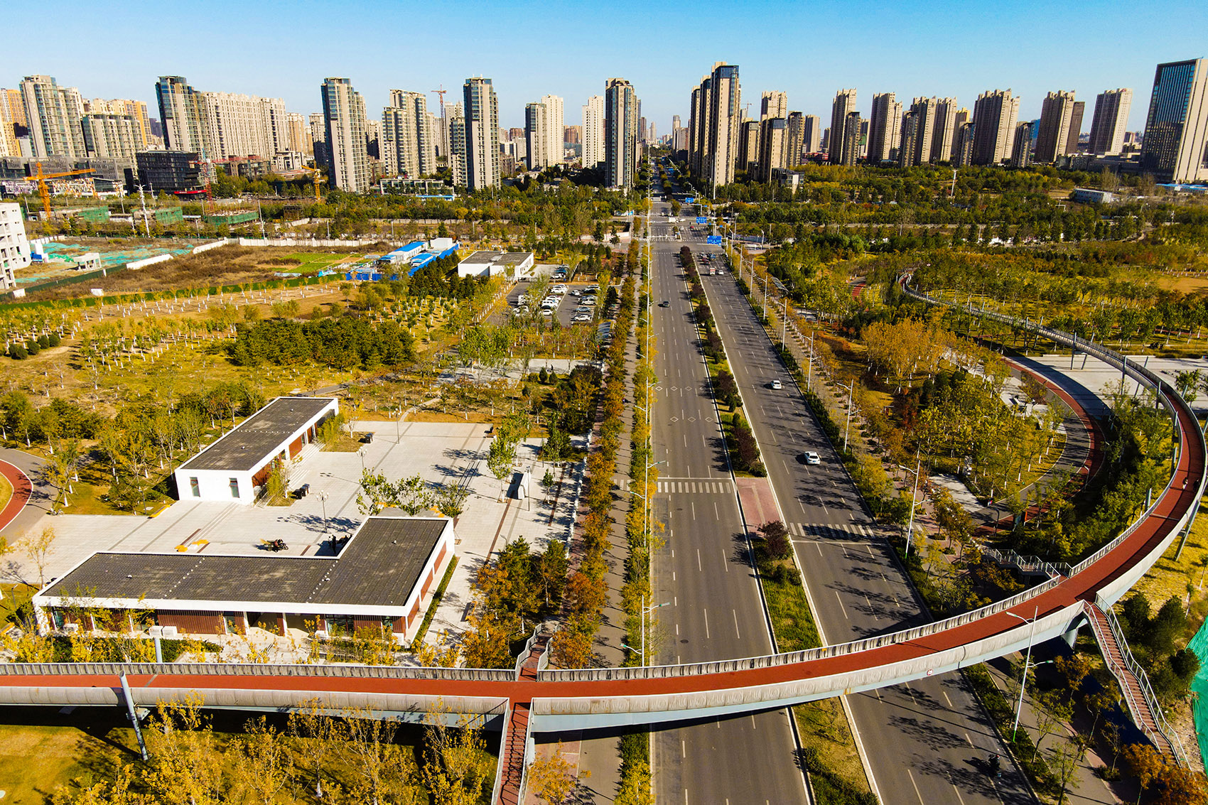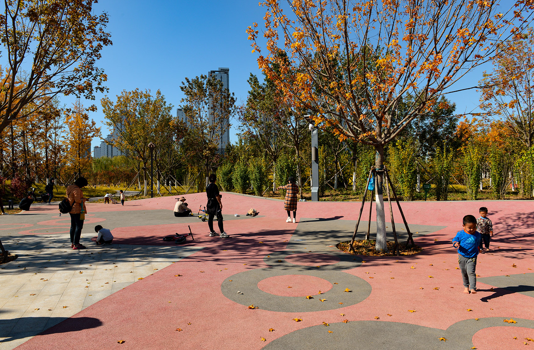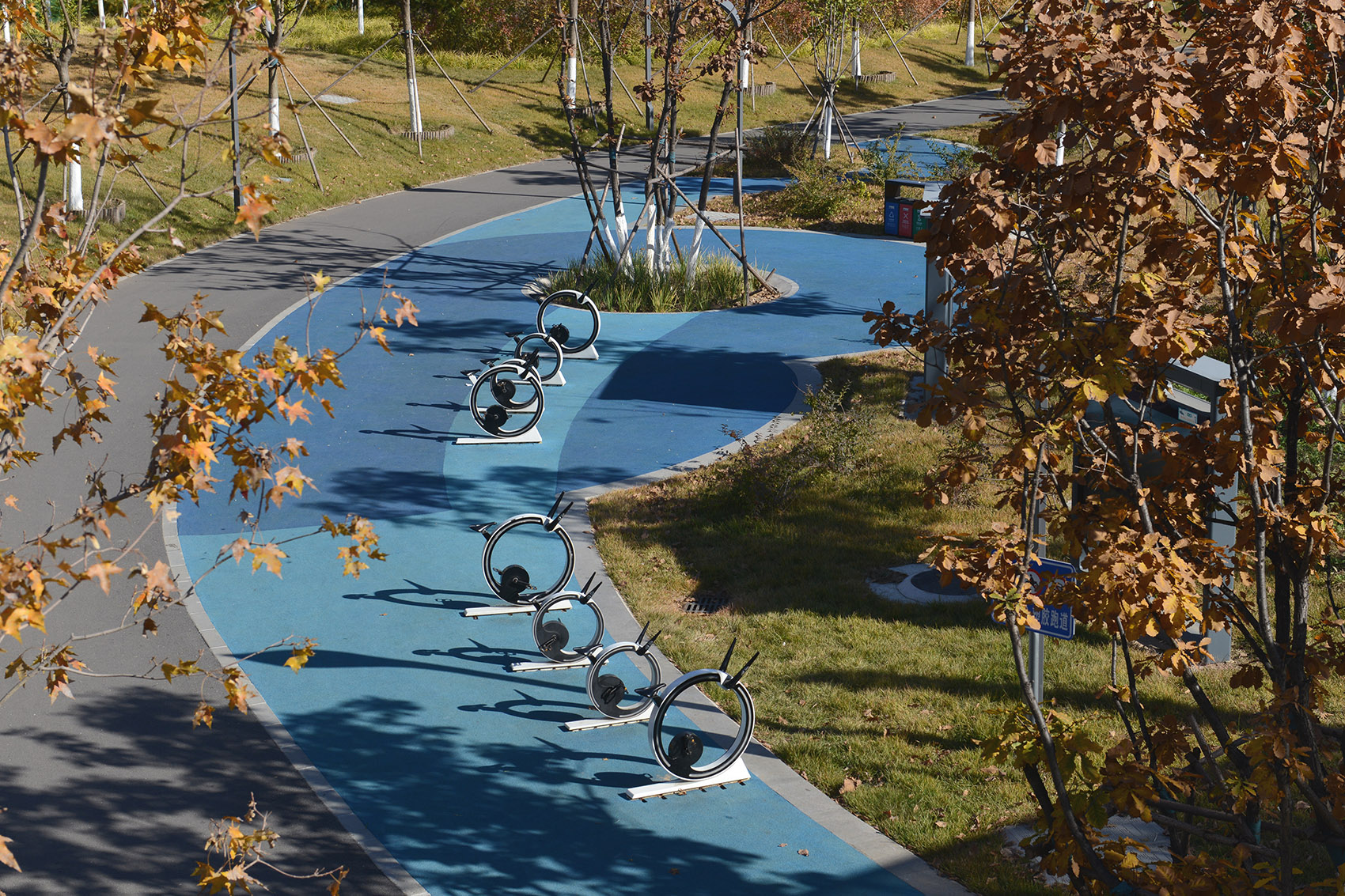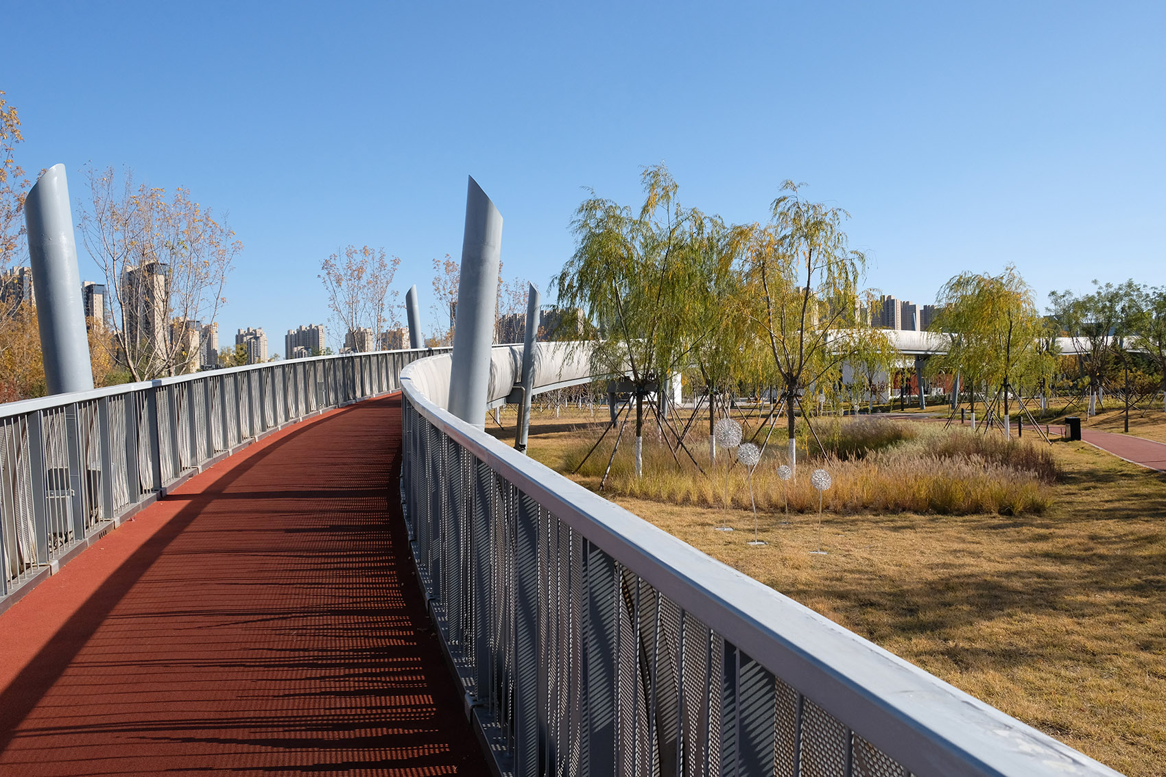 公園以三級園路及慢跑道構(gòu)成道路體系,景觀飄橋連綴各地塊,實現(xiàn)便捷的立體交通連接。布置市民舞臺、文創(chuàng)廣場、兒童活動場地、球場等多元活動空間,融入智慧服務(wù)及互動設(shè)施,使游園活動充滿科技性與幸福感。