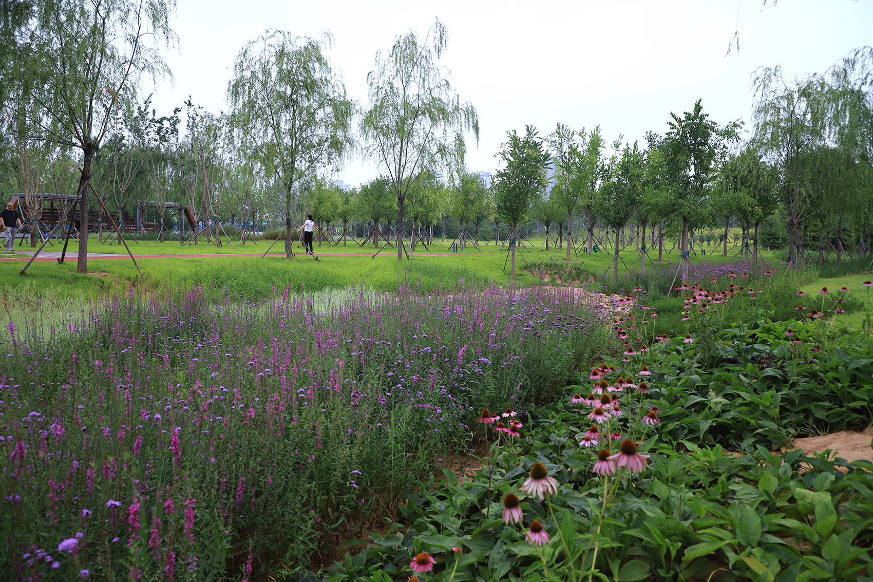 公園以近自然種植方式構(gòu)建城市森林,綠色鄉(xiāng)土植物作為本底,以群落形式發(fā)揮生態(tài)效益,節(jié)點(diǎn)附近集中種植觀花芳香植物關(guān)注近人感受。同時園內(nèi)在路側(cè)林緣位置設(shè)計雨水花園、下凹綠地等海綿設(shè)施,實現(xiàn)科學(xué)雨洪管理。