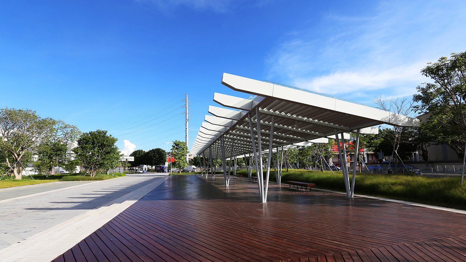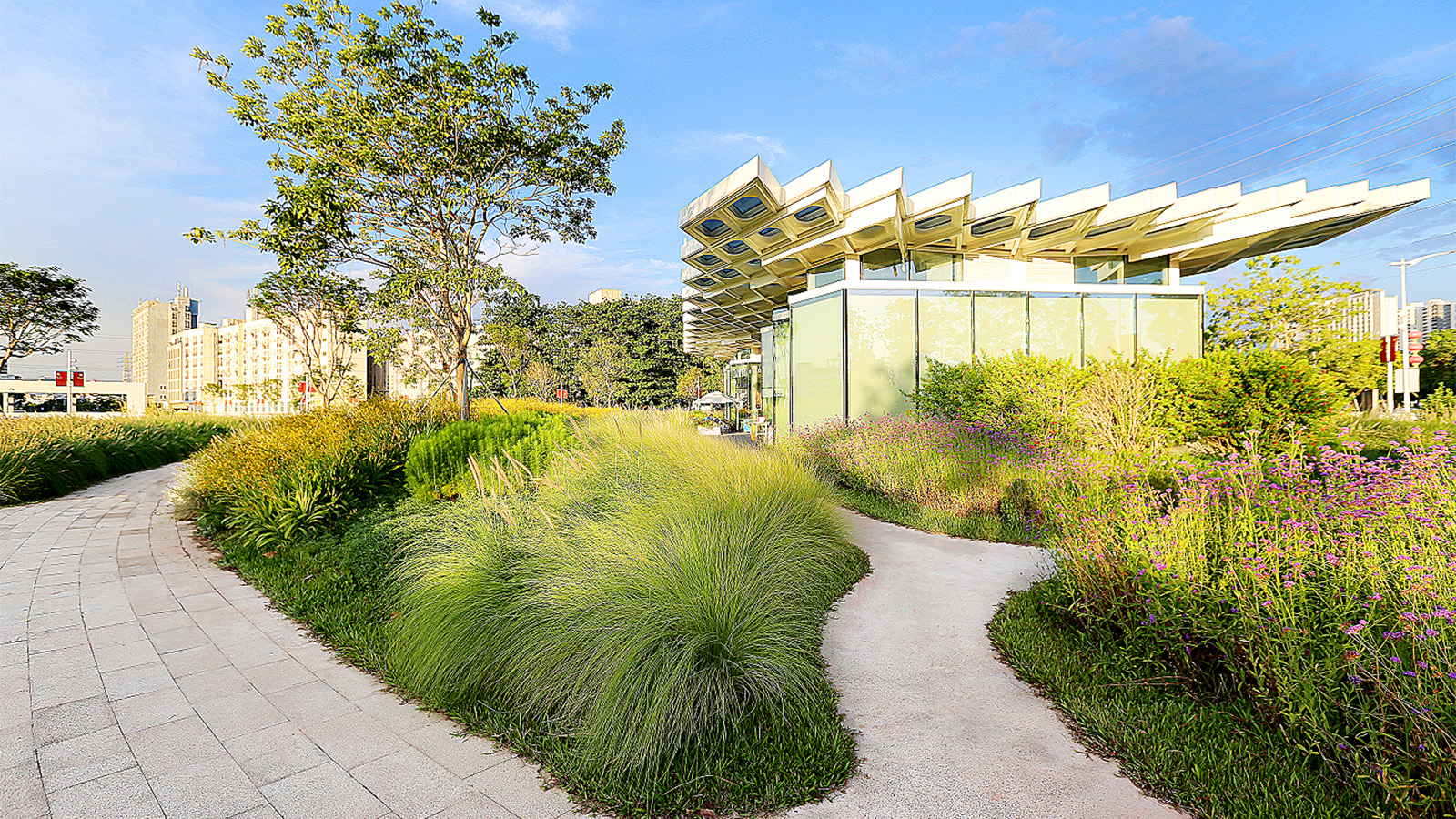 采用有機再生材料的公園主入口標識,運用輕型材料造型靈動的風(fēng)之廊,利用參數(shù)化設(shè)計菱形屋面與幕墻的花廊驛站,在周圍觀賞草景觀的映襯下,達成生態(tài)與藝術(shù)美感的統(tǒng)一,是展現(xiàn)智造新城創(chuàng)新風(fēng)尚的魅力空間。