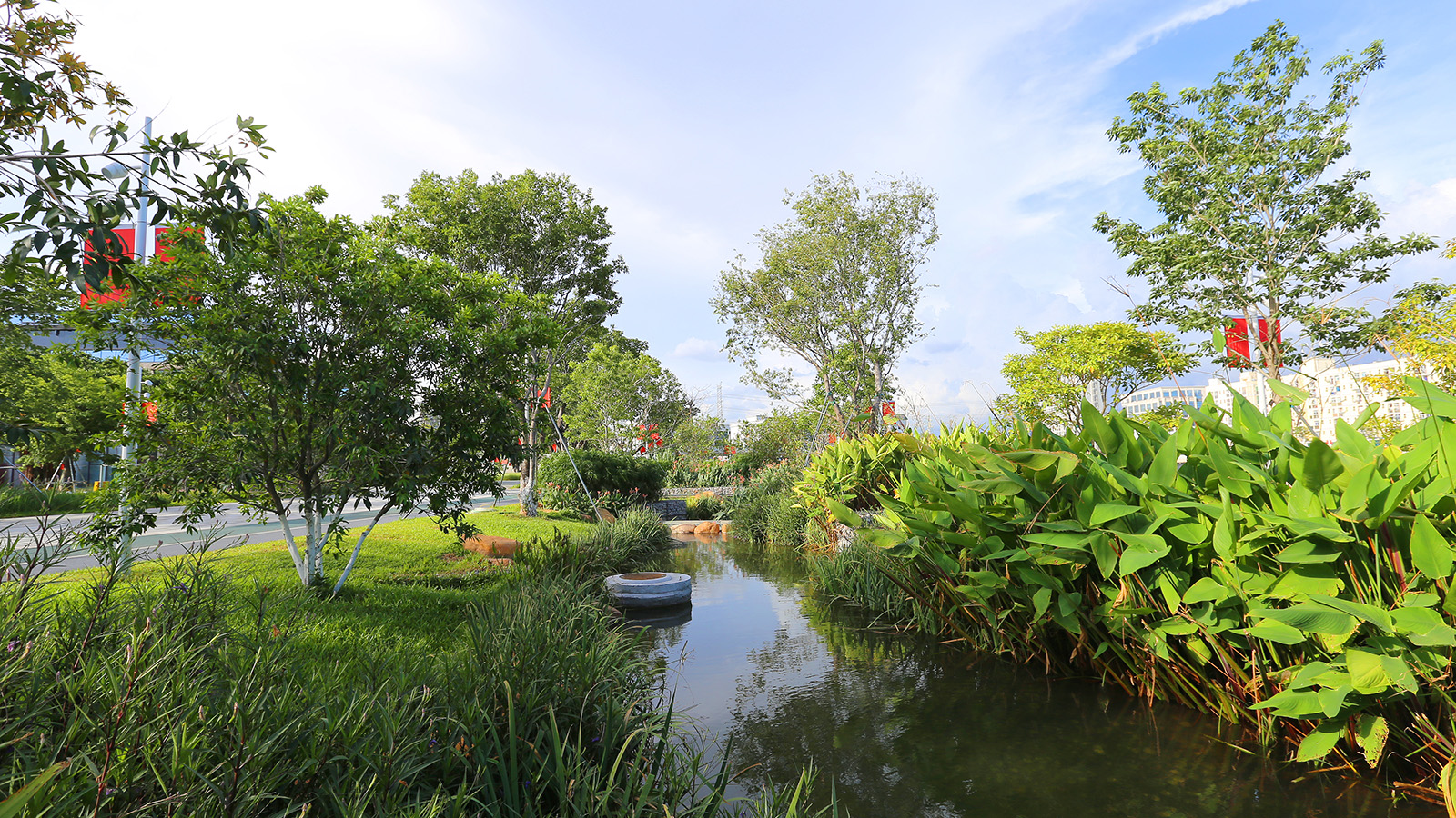 根據(jù)場地特性,綜合布局攔水、蓄水、凈水海綿設(shè)施,與公園風(fēng)貌打造有機結(jié)合,構(gòu)建兼顧雨洪調(diào)蓄、水質(zhì)保障、生物多樣性和科普展示功能的完善海綿體系。
