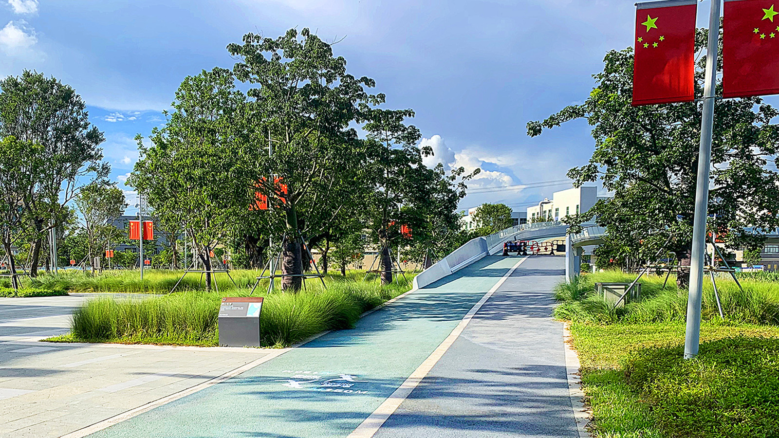 鏈接四個片區(qū)的慢行步道采用低飽和度的彩色透水混凝土鋪裝,匹配生態(tài)風(fēng)貌的同時強化主環(huán)線,兼具一定的雨洪峰值削減作用。