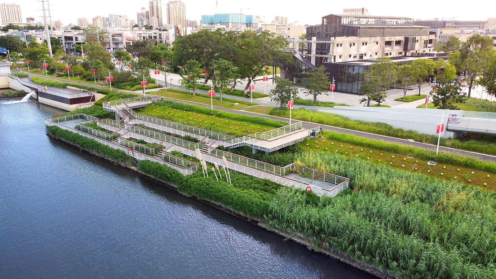 梯級濕地栽種多種凈水功能的水生植物,營造趣味怡人的水濕地景觀,吸引市民體驗和認知自然。梯級濕地之上架設(shè)多層觀景平臺作為濕地植物、濕地填料等水質(zhì)凈化要素的科普展示場所。