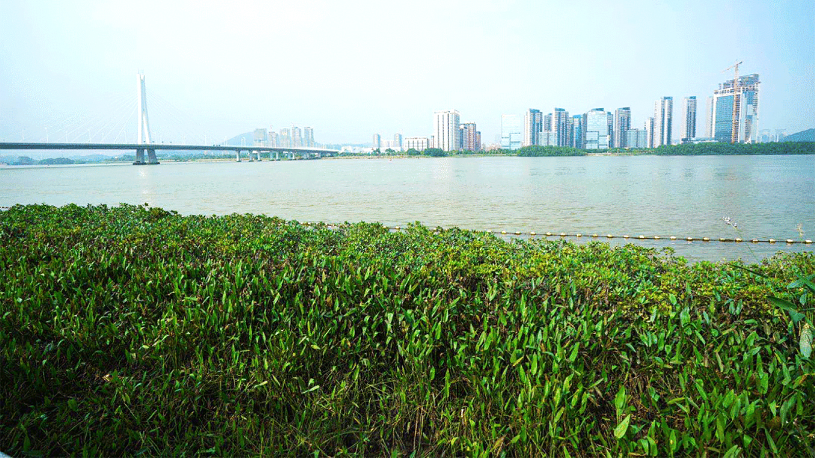 島上植物設(shè)計(jì)解決退潮時(shí)干砌石外露現(xiàn)象,根據(jù)不同的紅樹植物以及水生植物對(duì)水體鹽度的適應(yīng)性以及耐水淹、耐風(fēng)浪的情況,優(yōu)選鳶尾、蘆葦、狹葉香蒲、短葉茳芏、桐花樹、老鼠簕、苦郎樹等品種,進(jìn)行立體搭配。項(xiàng)目根據(jù)不同的岸線形態(tài),因地制宜進(jìn)行植物種植的空間分布,兼具景觀和生態(tài)效果。無島嶼的平直岸線采用花境式植物配置模式,在保證視野開闊的前提下,增加近岸不同體驗(yàn)感受。設(shè)計(jì)在充分保護(hù)自然島嶼的基礎(chǔ)上,僅在欄桿下補(bǔ)植低矮的濕生及水生植物,用以遮擋近欄桿處的泥灘,與原有的自然島嶼形成協(xié)調(diào)統(tǒng)一的生態(tài)風(fēng)貌。
