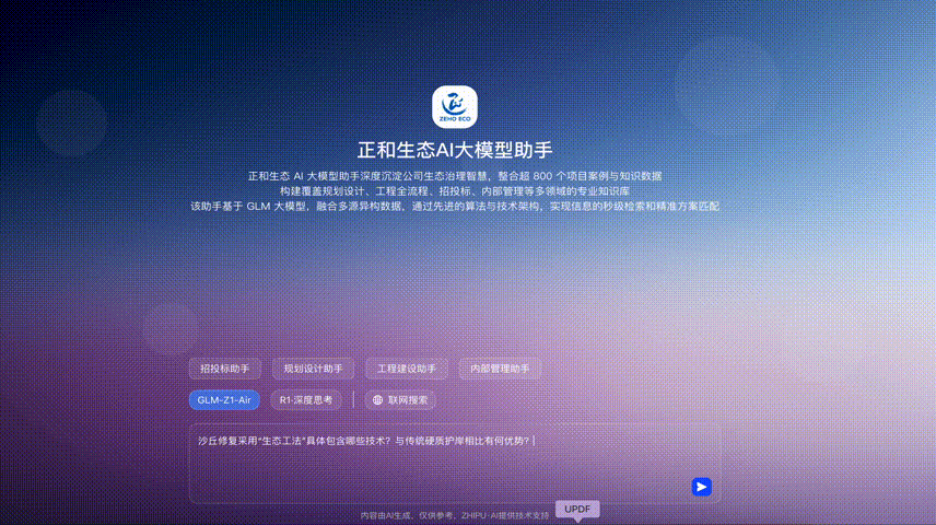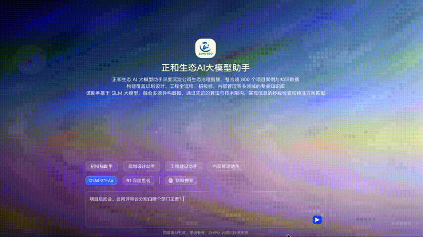 Recently, the ZEHO ECO Knowledge Base completed testing and was officially launched. This achievement marks a critical step in the company's intelligent transformation within the ecological environment field. The core system of this knowledge base, the "AI Large Model Assistant," deeply integrates ZEHO ECO's 28 years of industry experience and the foundation of the Zhipu GLM large model. It combines the dual AI models of Zhipu Z1 and DeepSeek R1 to build an intelligent interactive hub covering the entire chain of tendering/bidding, planning & design, engineering construction, and internal control management. It enables information retrieval within seconds and intelligent, precise push notifications, providing strong support for efficient operations, intelligent decision-making, innovation capabilities, as well as market expansion and customer service.