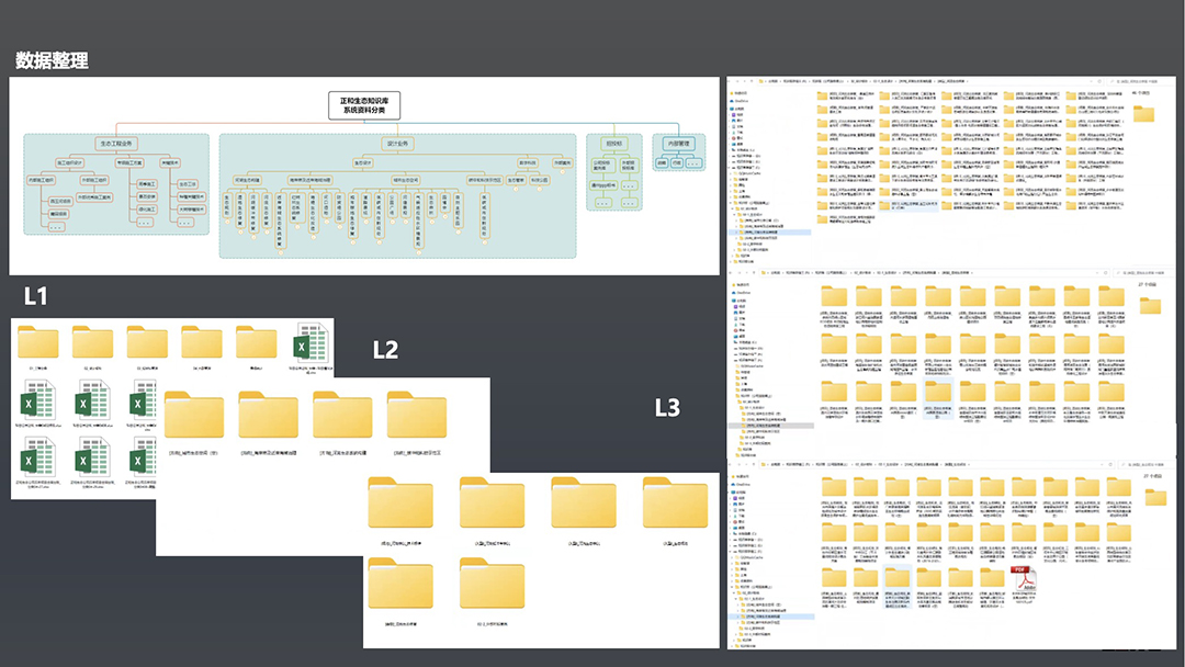 First, based on business scenarios, we planned the top-level architecture of the knowledge base, defining key modules like tendering/bidding, planning & design, engineering construction, and internal control management, ensuring the knowledge system tightly aligns with actual business needs. Second, we hierarchically subdivided modules, constructing a tree-like classification structure for clear knowledge categorization. For example, within the engineering construction module, we segmented based on business scenarios: L1 main business (ecological environment), L2 sub-businesses (ecological engineering, ecological operation & maintenance), and L3 business products (river ecological restoration, urban brownfield restoration, nearshore marine ecosystem restoration, ecological seawall renovation, ecological forests, etc.), organized logically to lay the groundwork for later data vectorization. Finally, we organized actual knowledge resources (documents, data tables, R&D experimental data, etc.) according to this classification structure, creating corresponding sub-folders for orderly storage, enhancing knowledge reuse and management efficiency.