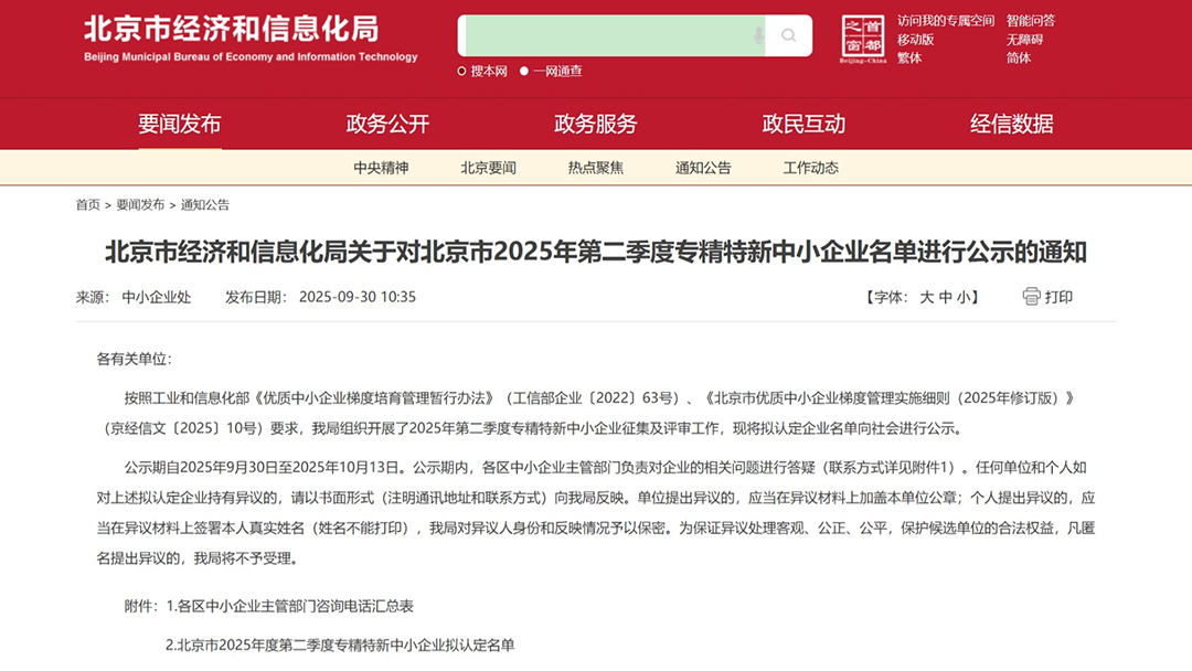 Beijing 2025 Q2 Specialized, Refined, Distinctive, and Innovative SME List Announcement Document