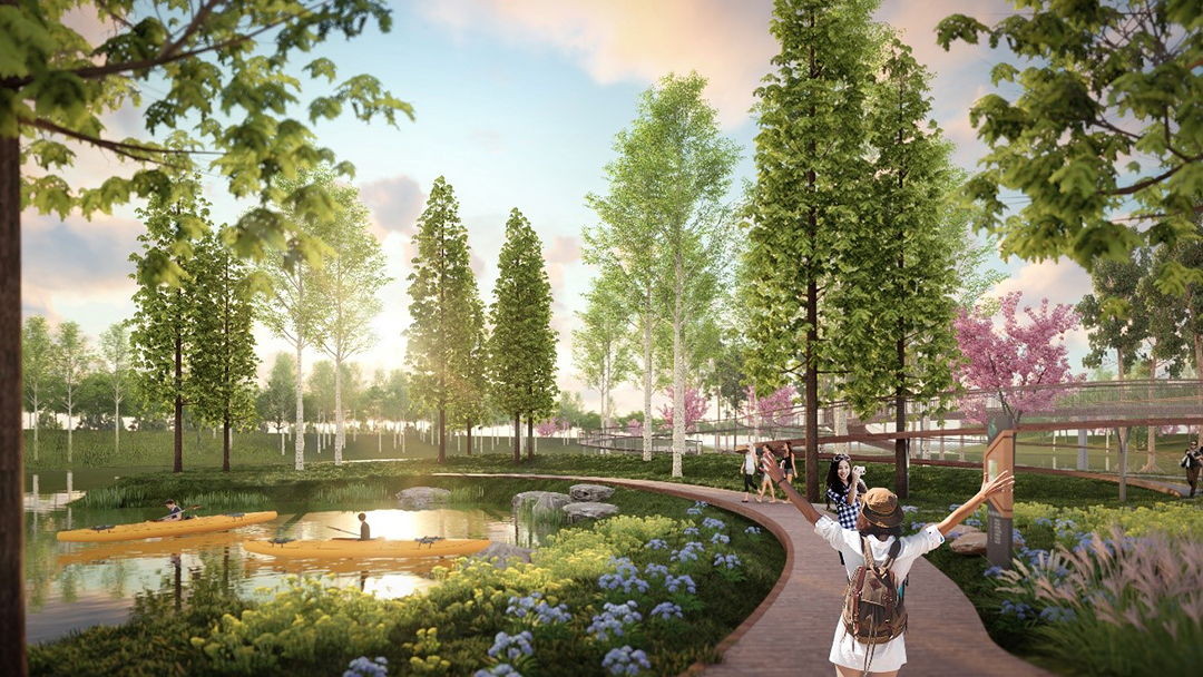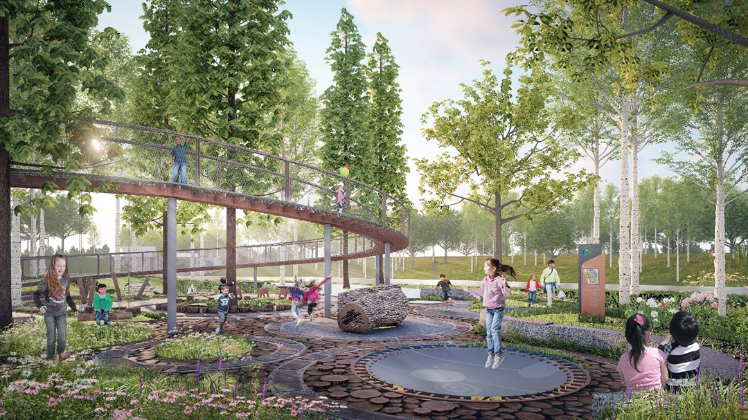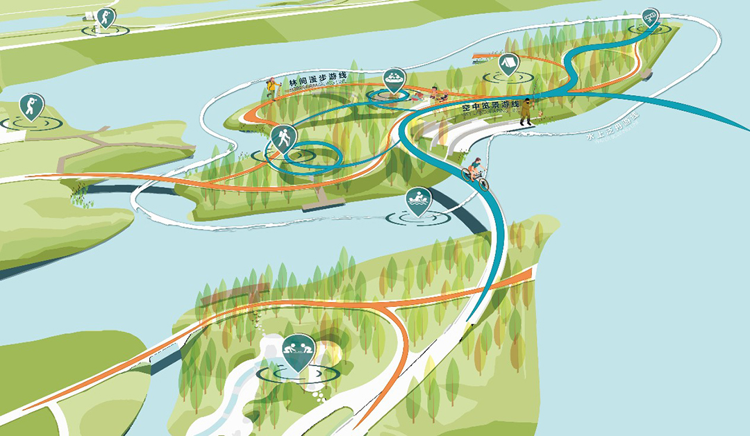 Hydraulic Park: follow the guiding ideology of dredging rivers and guiding stagnation, increase watercourses and streams, improve the hydrodynamic force in the region, and enhance the community renewal ability. Set up ecological interactive experience Park and hydraulic Experience Camp in the upper and lower peninsula according to local conditions. Based on ecological restoration, multi-dimensional and three-dimensional ecological interaction science popularization and regional cultural perception will be increased through implementing nine revetment types of ecological construction methods, forest restoration with five canopy densities, new watercourses and purified wetlands.