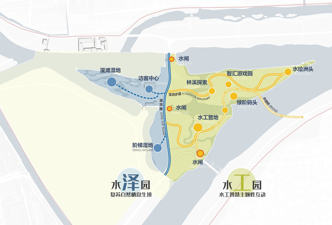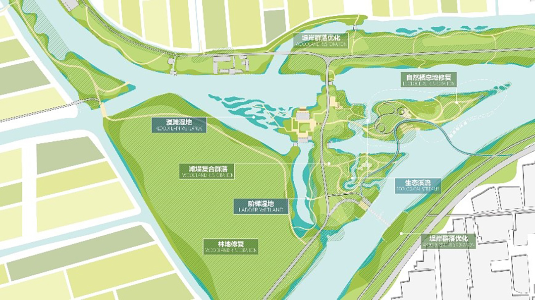 Biodiversity protection is one of the starting points of the project. The dynamic ecological protection goal is achieved through the coupling of four-dimensional blue-green space. Combined with the water conservancy operation of hydraulic facilities, the flexibility of the ecosystem is shaped, and the diversified ecological categories, habitat communities and ideal habitat for fish and birds are constructed. Respecting the site texture, resource endowment and hydrological characteristics, the core area of the site is divided into two ecological zones: the Hydraulic Park and the Shuize Park, to provide a harmonious and interactive diversity habitat space for people and organisms.