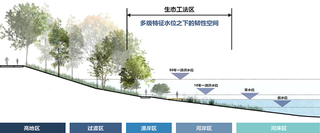 First, the basic characteristics of the site are determined through on-the-spot investigation, and the technical parameters of the natural flowing river are deduced according to the site identification and regional characteristics. In the process of river section design, according to the water level, elevation and relative position to the river, the river and riverside area are divided into five areas: high area, transition area, flood bank area, river bank area, and riverbed area. Among them, the flood bank area and the riparian area with the elevation between the flood level and the low water level are used as the main design area of the ecological construction method, which not only plays the function of elastic design and enhances the system resilience, but also slows down the erosion of the river bank by the water flow. , and provide habitat for creatures, with high ecological value.