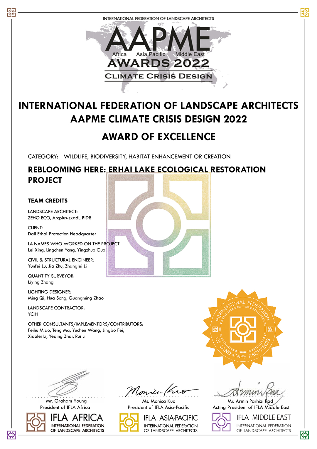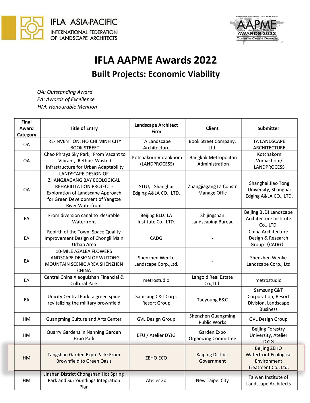 Two ZEHO ECO projects have been recognised at the 2022 International Federation of Landscape Architects Awards (Asia Pacific region): Erhai Lake Ecological Restoration Project with an Award of Excellence and Tangshan Garden Expo Park with an Honourable Mention.