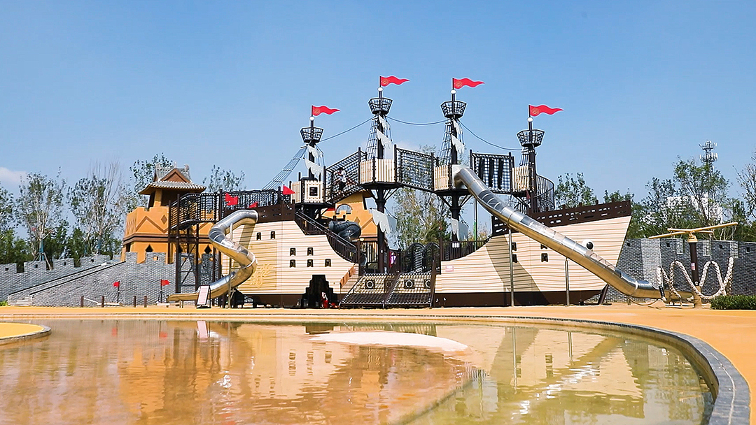 The large rudder boat is based on the image of a wine carrying ship, integrated with multiple climbing facilities such as rope net climbing and large slide. Its appearance is decorated with Chinese traditional dragon patterns, and the overall color is yellow and brown, reflecting the retro charm of the Canal City. The head of the bow shows the majestic momentum of the large rudder ship. The high mast is full of flags, and the large slide on the high platform shuttles to the sand pool, arousing the desire of adults and children to explore!