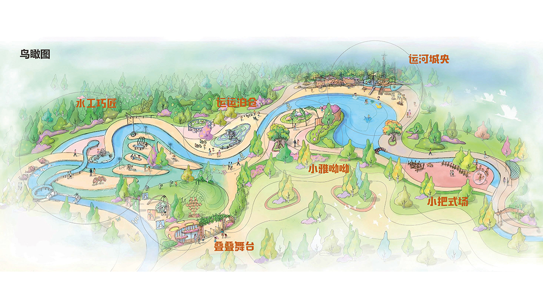 The whole park site is a “condensed” Cangzhou section canal, which is diverting water into the park with ecology, and vividly represents the symbiotic relationship between Cangzhou and the canal with tortuous water flow; Taking water as the vein, it connects the six nodes of the “stacking stage”, “hydraulic craftworker”, “transportation berthing”, “canal city center”, “xiaoya youyou” and “small handle type field” in a beaded way; Based on the text, cultural elements are extracted in a differentiated way, so that children can play around a city in a paradise, and the surprises of exploration and growth experience are included in the story of the Cangzhou Canal.