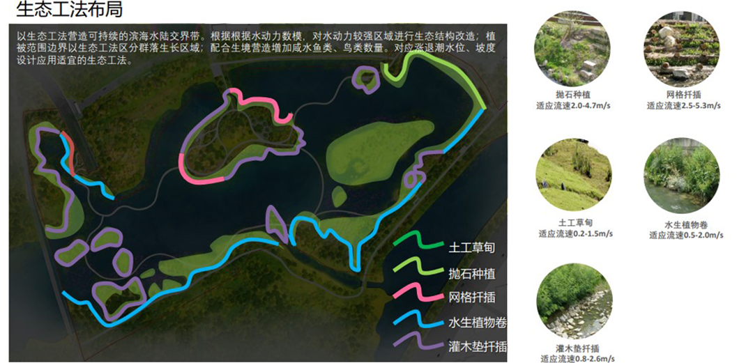 According to the site conditions and the needs of habitat construction, during the construction of the Ziyu Lake Wetland, five construction methods were mainly applied, including riprap planting, grid cutting, geotechnical meadow, aquatic plant roll and shrub pad cutting. The specific application scope is shown in the figure.