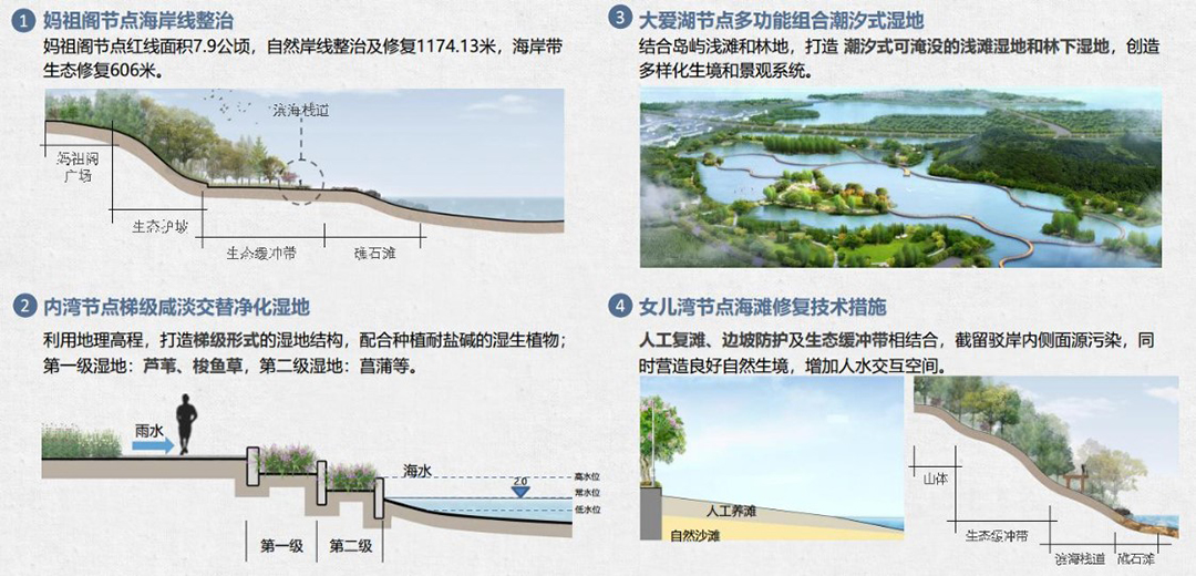 As a transitional zone between ocean and land, coastline is an important part of natural ecological space. With the rapid economic and social development of China’s coastal areas, the development intensity of the coastline and coastal waters is increasing. As a result, the area of bays and coastal wetlands has decreased, marine habitats have largely disappeared, and coastal ecological functions have significantly degraded, seriously threatening the safety of marine ecosystems; Extensive shoreline utilization methods, such as sea reclamation, tidal dyke, land reclamation, etc., have dramatically reduced the number of shorelines available for development and utilization, highlighted the conflicts between industries in shoreline utilization, and affected the sustainable economic and social development of coastal areas. Guided by the concept of protecting ecological security, adhering to scientific regulation, optimizing shoreline configuration, and expanding hydrophilic space, ecological measures with low cost, low maintenance, and high ecological benefits have become preferred.