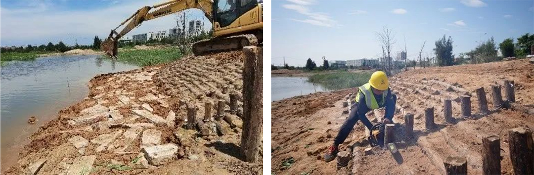 Among them, riprap planting is suitable for gently eroded upstream water with steep slope, and consists of plant cuttings and riprap. Lay staggered flat stones in the riprap revetment, insert the treated plant branches into the gaps between riprap. With the growth of plants, the plants and the wooden pile grid are connected as a whole, and the stability will increase year by year, effectively preventing the erosion of water flow and wind waves; The aquatic plant roll reflects the characteristics of local materials, which use plant root groups and construction waste to bind into a roll structure to create animal and plant habitats.