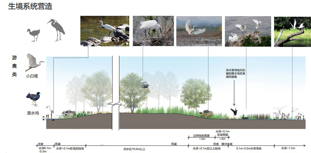 By analyzing the existing animal and plant species and their habitat characteristics of the Ziyu Lake, the project team planned to build a new habitat system and create a horizontal distribution of habitat and a vertical habitat of deep groove shoal in combination with the landform, to measure the geomorphic attributes comprehensively.