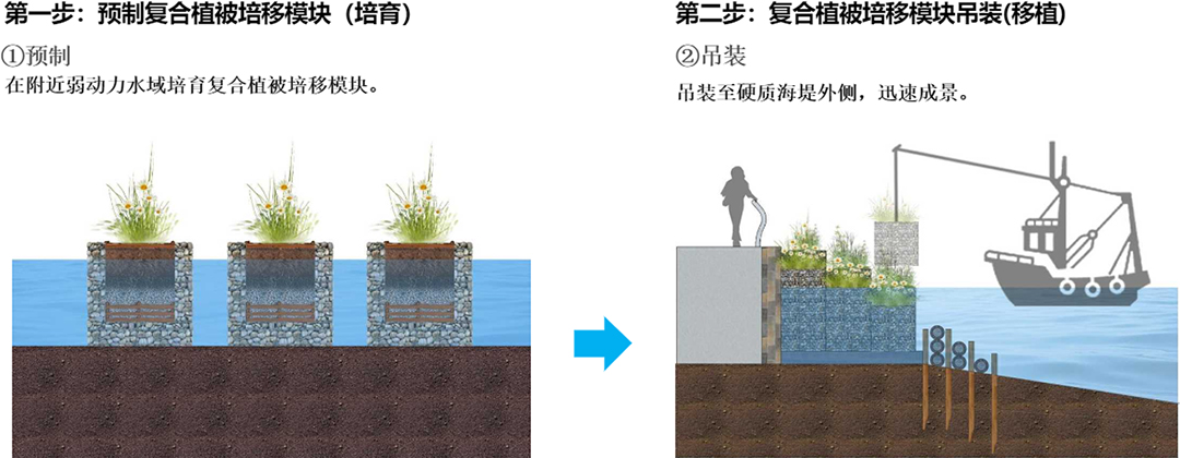 Among them, the newly developed ecological engineering module transfer technology based on the concept of NbS can solve the problems of low survival rate of powerful coastal vegetation and low efficiency of offshore construction costs, providing a new solution for the ecological transformation of hard seawalls.