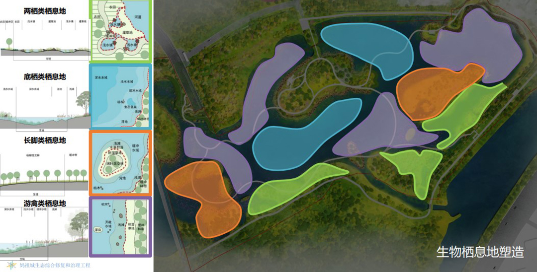 According to the requirements of animal habitat environment and the local vegetation conditions, the habitat system construction design was carried out to plan suitable habitat areas for benthos, amphibians, macropods and migratory birds, and the surface vegetation and specific construction methods were designed according to their needs for spawning, foraging, nesting, shelter, landform, water flow rate, etc.