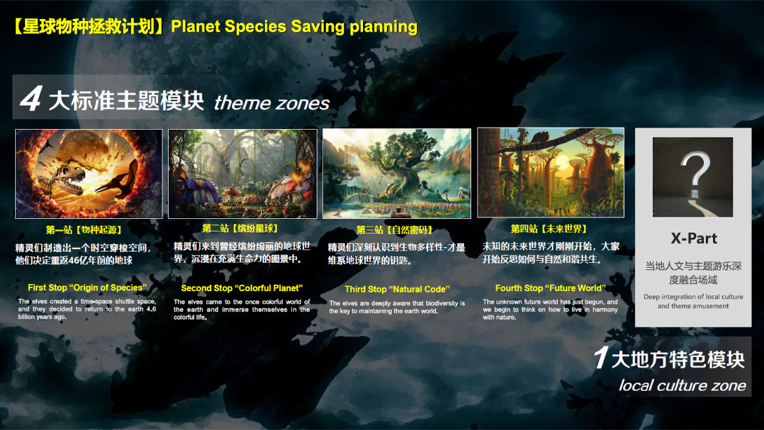 The park includes four standard theme modules: the origin of species, the colorful planet, the natural code, and the future world: the origin of species, an epic of the evolution of life on the earth spanning 4.6 billion years; Colorful planets, explore the colorful life world, light up children’s natural cognition; The natural code reveals the evolution of nature, science and technology and humanity; In the future world, we will build a harmonious earth home between human and nature in the new ecology and new species in the future. Different local parks will combine local culture and create X-Part local characteristic modules.