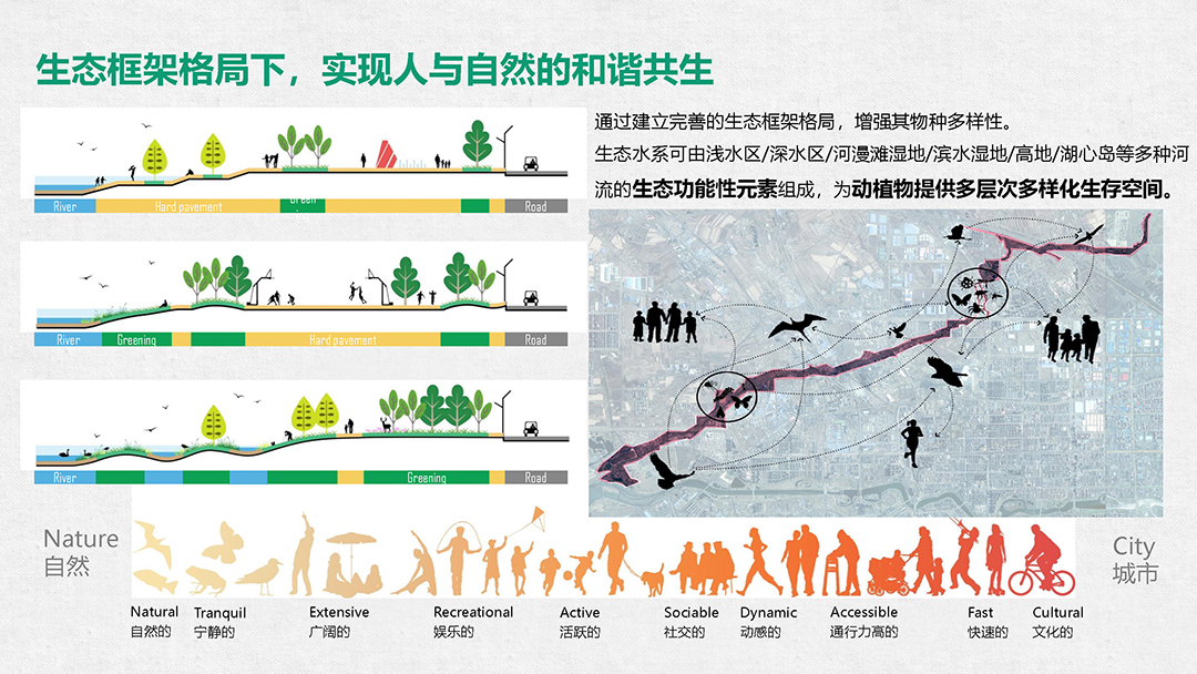 正和生態(tài)將生態(tài)低碳作為營建濱水空間的核心理念,通過基于自然的解決方案(NbS)構(gòu)建河流水安全管理體系、倡導(dǎo)創(chuàng)新低碳工藝應(yīng)用、強化生物多樣性保護,重塑城市濱水空間綠色基底。