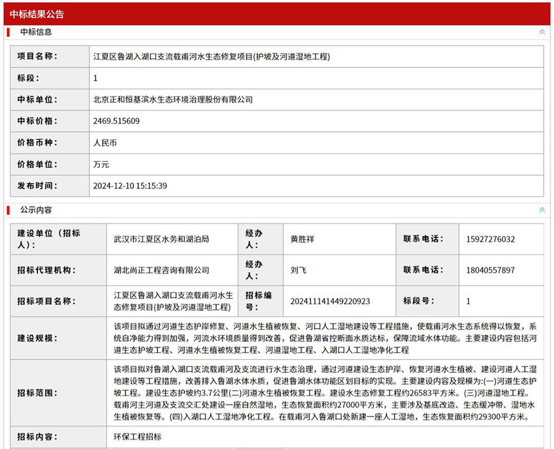 2024年12月10日,正和生態(tài)成功中標(biāo)江夏區(qū)魯湖入湖口支流載甫河水生態(tài)修復(fù)項(xiàng)目。此次中標(biāo),標(biāo)志著公司于2024年6月中標(biāo)武漢重點(diǎn)湖泊流域污染溯源及水環(huán)境管理項(xiàng)目后,在武漢市場(chǎng)取得了又一重大突破,為公司未來(lái)在該區(qū)域贏(yíng)得更多市場(chǎng)機(jī)遇和訂單奠定了堅(jiān)實(shí)的基礎(chǔ)。