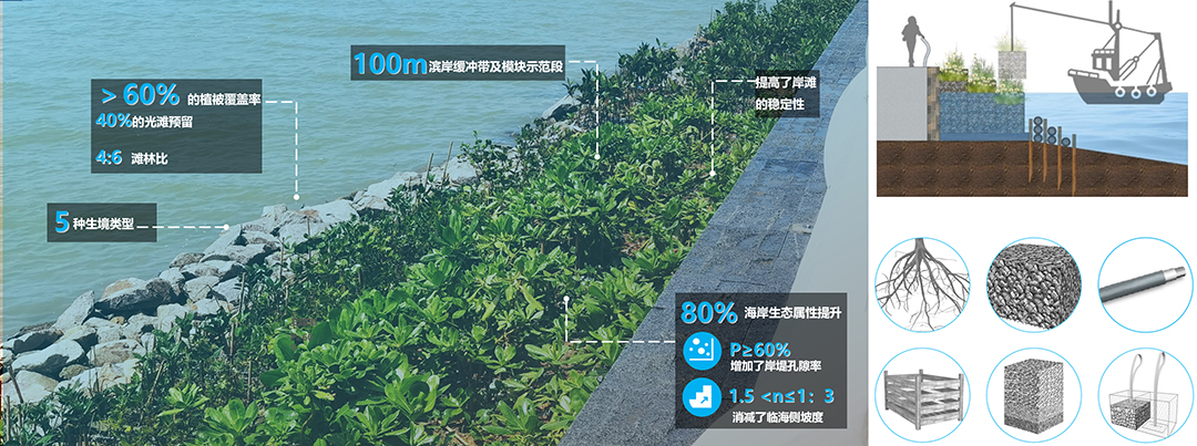該模塊通過吊裝裝配方式科學構建4:6的灘林比,孔隙率較傳統(tǒng)海堤結構提升60%;同時精準“縫合”堤海界面,從陸向海梯度營造出鹽沼生境-半紅樹生境-紅樹生境-光灘潮汐生境-底棲生境多重潮間帶棲息空間,大幅提升海岸生態(tài)系統(tǒng)的多樣性與穩(wěn)定性。