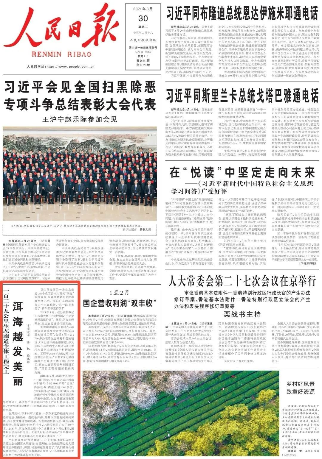 3月30日,《人民日?qǐng)?bào)》頭版刊文《一百二十九公里生態(tài)廊道主體工程完工 洱海越發(fā)美麗》,再次聚焦洱海。