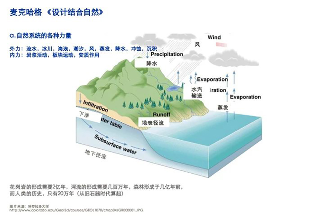 王老師首先對“Design with Nature”作出了自己的解釋。他認(rèn)為Design with Nature譯為《設(shè)計順應(yīng)自然》更為合適,甚至是遵從自然,這樣更能準(zhǔn)確、真實地反映麥克哈格的信念?!敖Y(jié)合”一詞頗有玩弄自然于鼓掌之間的玄學(xué)之味,他強調(diào),希望通過對麥克哈格先生理念思想的解讀,達(dá)到“正本清源”的目的,提醒青年規(guī)劃師設(shè)計師們重拾初心,也多些敬畏之心,腳踏實地的去做好每個項目。
