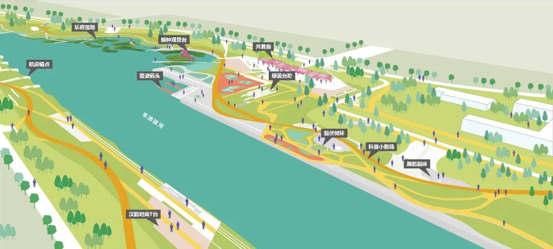 在構(gòu)建豐沛運河藍(lán)綠框架過程中,我們分析了傳統(tǒng)分段定義的模式,單一的風(fēng)貌特征分區(qū)無法達成藍(lán)綠共融共生的生態(tài)品質(zhì)雙重訴求。根據(jù)沛縣入微河道水體雙向流動的水文特征,創(chuàng)新性提出了“雙向潤城”的空間格局——將參與式生境從微山湖/南四湖帶進城市,讓公眾生活漫行到湖邊風(fēng)光。