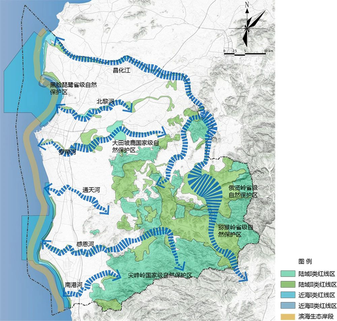 通過統(tǒng)籌東方市海陸空間山體、海洋、林地、河流、水庫、濕地等生態(tài)資源,協(xié)調(diào)區(qū)域生態(tài)紅線空間格局,建立規(guī)劃區(qū)內(nèi)河流、濕地、林地組成的在地保護(hù)系統(tǒng)。