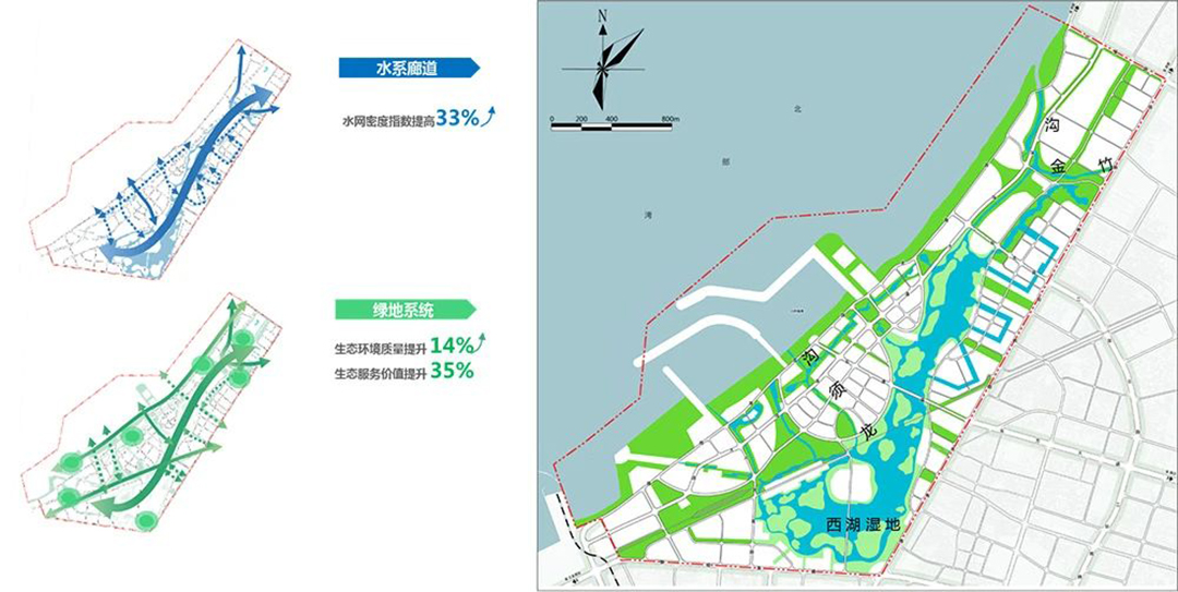 通過研究規(guī)劃區(qū)內(nèi)濕地、河流、海岸帶現(xiàn)狀問題,進(jìn)行河渠治理和生態(tài)改造、濕地保護(hù)與修復(fù)、海岸帶保護(hù)與利用。重點(diǎn)打造西湖濕地復(fù)合生態(tài)系統(tǒng),在保障濕地雨洪調(diào)蓄基本功能的同時(shí),通過基底改造、水文條件恢復(fù)以及岸帶生態(tài)海綿的建設(shè),保障濕地水系水質(zhì)達(dá)到地表IV水質(zhì)目標(biāo),并營造出開敞水域、葦叢濕地、沙洲島嶼等生境類型,實(shí)現(xiàn)場地生物多樣性和生態(tài)服務(wù)價(jià)值的提升。