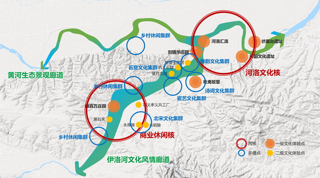 本項(xiàng)目著眼鞏義全域,重點(diǎn)聚焦鄭州黃河核心 示范區(qū)鞏義段、大運(yùn)河鞏義段,立足鞏義“生態(tài)環(huán)境建設(shè)、轉(zhuǎn)型目標(biāo)路徑、高質(zhì)量發(fā)展策略、兩河規(guī)劃建設(shè)”等發(fā)展重點(diǎn)與難點(diǎn),按照生態(tài)保護(hù)和高質(zhì)量發(fā)展兩大核心要求,塑造生態(tài)格局,挖掘文化資源,促進(jìn)經(jīng)濟(jì)產(chǎn)業(yè)轉(zhuǎn)型,提升城市品牌形象,以“打造黃河流域生態(tài)保護(hù)與高質(zhì)量發(fā)展先行示范區(qū)”為總體定位,以“生態(tài)先行、文化點(diǎn)亮、產(chǎn)業(yè)創(chuàng)新、城市升級(jí)”為發(fā)展路徑,實(shí)施“大生態(tài)、大平臺(tái)、大文旅”三大策略,一心引領(lǐng)、兩區(qū)支撐,構(gòu)建“兩心雙廊多節(jié)點(diǎn)”的空間結(jié)構(gòu),致力打造成為城市發(fā)展的生命綠源、文化體驗(yàn)的創(chuàng)新綠脈、城市發(fā)展的先行示范。