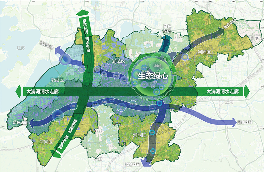 本次實施規(guī)劃在國土空間規(guī)劃“一心兩廊,三鏈四區(qū)”的多樣化生態(tài)格局下,完善綜合治理布局,從“生態(tài)水利”角度構建區(qū)域的水安全系統(tǒng)性工程,以“生態(tài)優(yōu)先、綠色發(fā)展”為指引,實施減量、增容、提質(zhì),重點構建四大體系,突出綠色發(fā)展的核心理念,逐步打造清潔、安全、美麗的河湖水系,建立功能融合、廊道聯(lián)通、服務多樣的生態(tài)系統(tǒng),形成基于綠色產(chǎn)品、綠色產(chǎn)業(yè)、綠色人文為特色的區(qū)域一體化綠色發(fā)展體系。