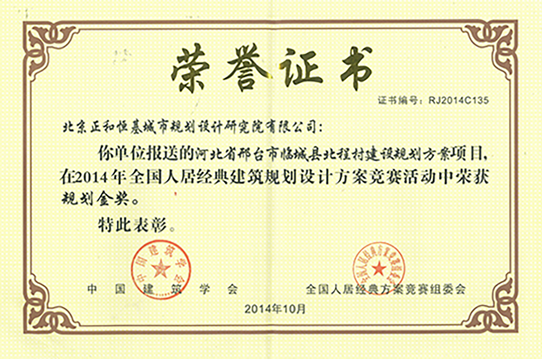 2014年10月26日,全國人居經(jīng)典建筑規(guī)劃設(shè)計方案競賽經(jīng)過數(shù)月甄選,最終完美落幕。北京正和恒基城市規(guī)劃設(shè)計研究院設(shè)計的河北省臨城縣北程村建設(shè)規(guī)劃方案項目,榮獲2014年全國人居經(jīng)典建筑規(guī)劃設(shè)計方案競賽規(guī)劃金獎。