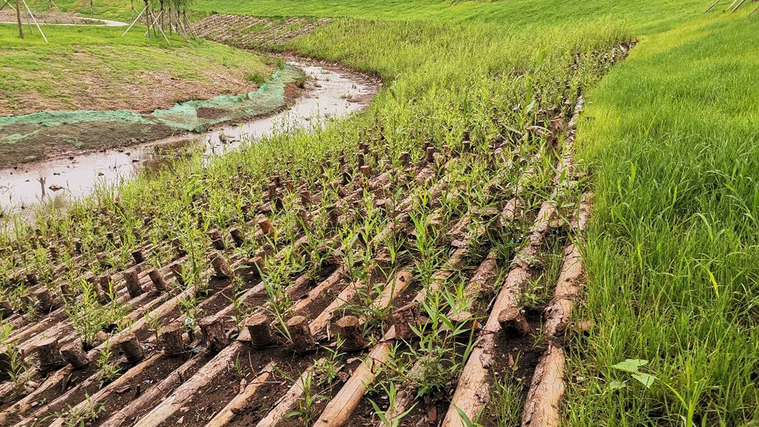 “生態(tài)工法正是一種基于自然的創(chuàng)新技術(shù),致力于創(chuàng)造有生命力的濱水結(jié)構(gòu)形態(tài)。”李寶軍介紹,生態(tài)工法可以概括為基于水利安全,以生態(tài)修復(fù)為導(dǎo)向,實(shí)施水土保持、輔助凈化、物種保育,從而鼓勵(lì)自然做工與演替的工程實(shí)施方法。該工法結(jié)合工程技術(shù)與生物學(xué)特性需求,利用植物根系的土壤固持作用及植物緩沖截流能力對(duì)邊坡進(jìn)行穩(wěn)定加固、提升抗沖刷性能,同時(shí)豐富的濱水植物不僅幫助水質(zhì)凈化提升,也營(yíng)造了生物棲息環(huán)境,以此提高生態(tài)穩(wěn)定性。