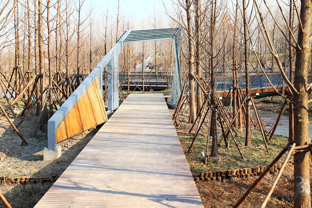 在延續(xù)區(qū)域的肌理風貌方面,“沁段落”通過“ 藍綠耦合”、海綿系統(tǒng)、藝術表現(xiàn),以及AR(增強現(xiàn)實技術)與VR(虛擬現(xiàn)實技術)的智慧互動等手段,將宋詞意境、漢文化元素、樂府詩篇融入到項目的生態(tài)場景空間,并貼近人們的日常生活,做到“無言之教”;利用對特色空間的營造,為訪客特別是青少年帶來濕地漫步、生態(tài)感知、濱水體驗、水工互動、運動休閑等多維感受,創(chuàng)建成青少年戶外課堂,并將其建設成為河湖長制生態(tài)保護實踐基地。