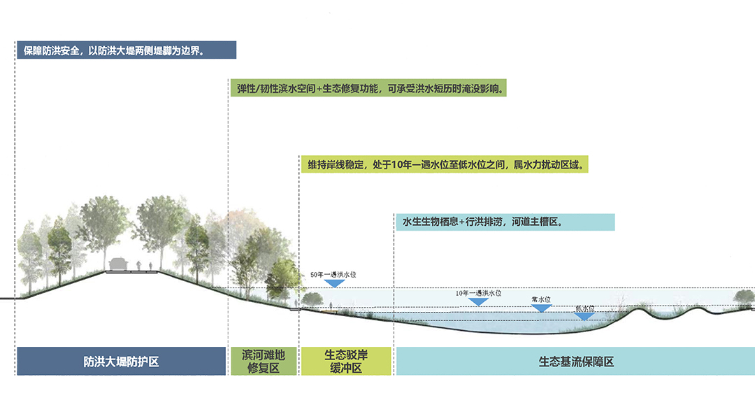 根據(jù)現(xiàn)場實際情況,正和生態(tài)綜合考慮現(xiàn)狀岸線坡度、洪水期河道流速、河道淹沒范圍等因素,結合設計豎向、配套設施布置及防洪排澇控制要求,遵循“少筑堤、多護岸,寬河面、重保灘,強基礎(固堤腳)、重結構”的原則,因地制宜遴選出了自然植被護岸、多級水生植物護岸、三維植被網(wǎng)植草護岸、植物扦插護岸、扦插休眠護岸等7種生態(tài)工法,構建穩(wěn)定的“水、岸、灘、堤”多層級濱水空間,以實現(xiàn)水土保持、徑流緩沖凈化、生物多樣性保護等生態(tài)功能。