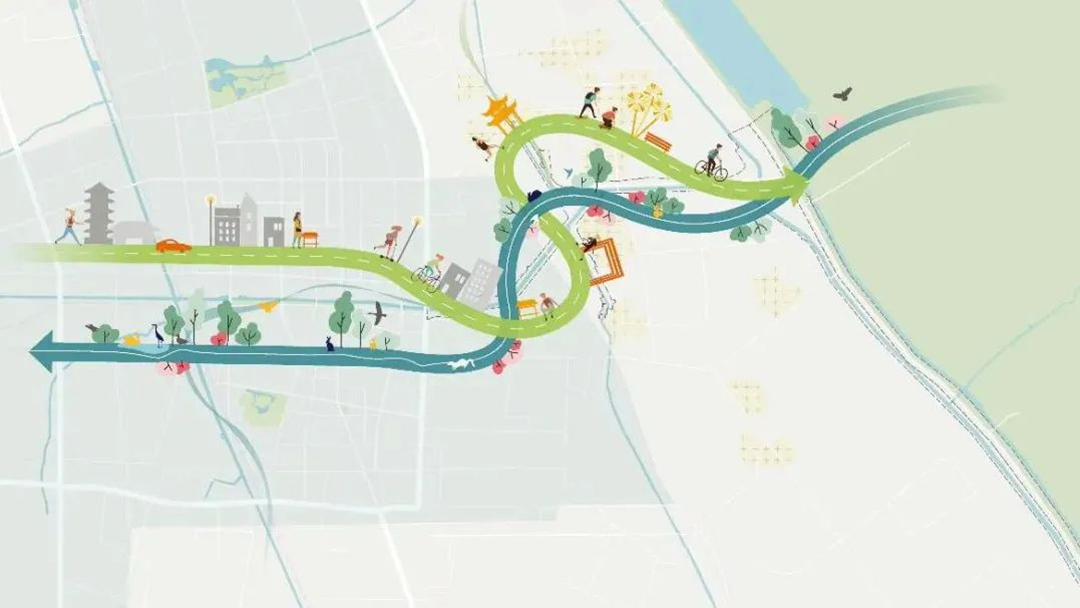 在設計之初,沛縣沿河生態(tài)修復提升項目就確立了“藍、綠、灰、紅”的梯次遞進層級,具體表現(xiàn)為流域水環(huán)境提升(藍)、自然生境耦合(綠)、濱岸活力潤色(灰)、地域文化交融與產(chǎn)業(yè)拉動(紅)等多元復合立體空間層級。