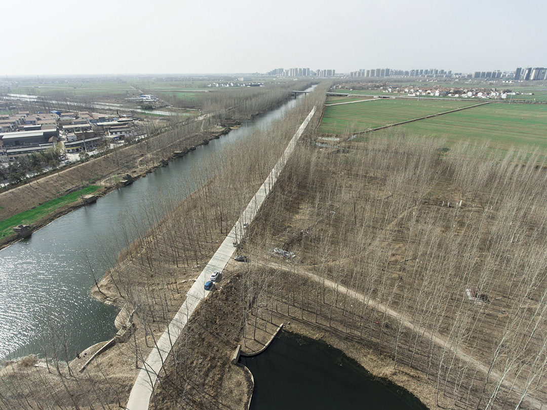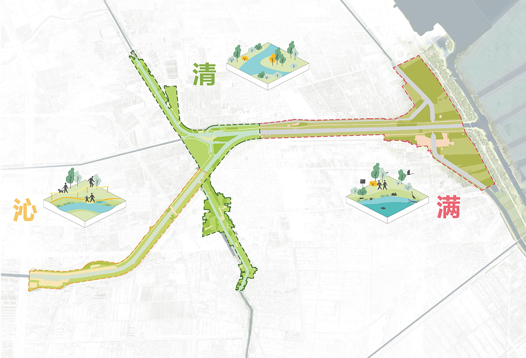 為此,沛縣啟動了南四湖流域沛縣沿河生態(tài)修復提升項目。項目總長度約9.8公里,其中包括沛縣沿河東環(huán)路至入微山湖河口段約6.6公里,蘇北堤河與沛縣沿河交匯段約3.2公里,項目范圍約270.5公頃。整個項目分為“沁”“清”“滿”3個空間段落,分別對應“沁園春”“清平樂”“滿江紅”3個詞牌名。