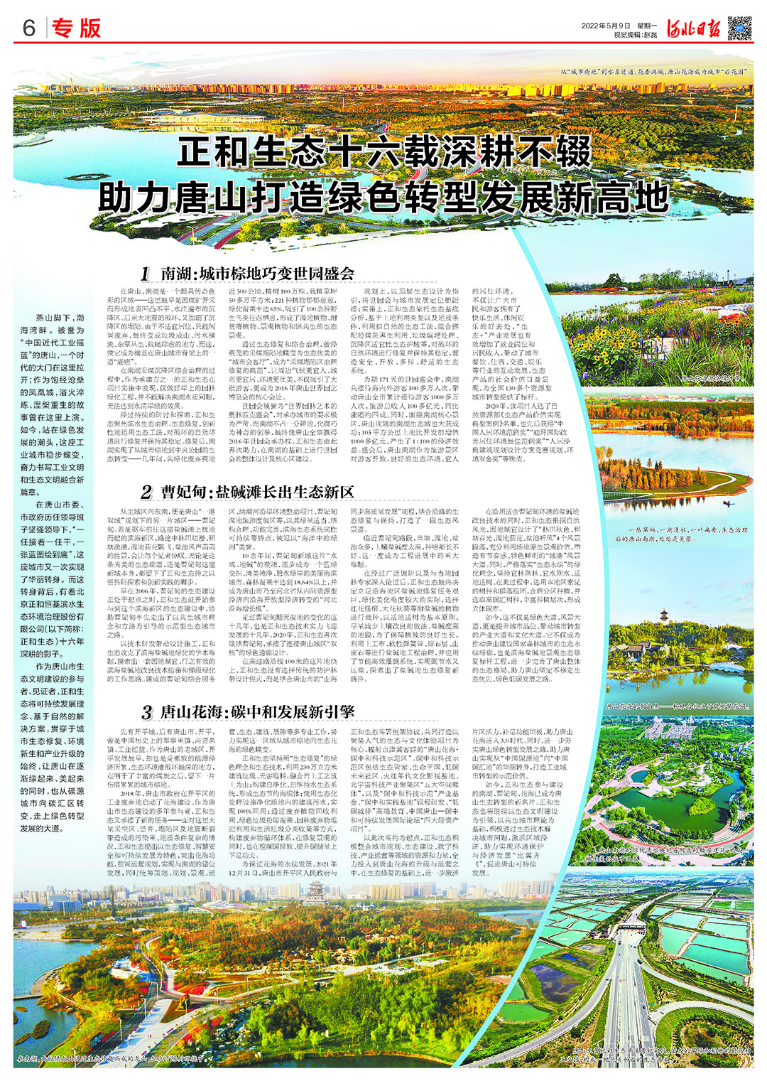 5月9日,《河北日報》刊登整版專題《正和生態(tài)十六載深耕不輟 助力唐山打造綠色轉(zhuǎn)型發(fā)展新高地》。唐山,這座工業(yè)城市逐漸綠起來、美起來、從碳源城市向碳匯區(qū)華麗轉(zhuǎn)身的背后,是正和生態(tài)作為唐山市生態(tài)文明建設(shè)的參與者、見證者,將可持續(xù)發(fā)展理念、基于自然的解決方案,貫穿于城市生態(tài)修復(fù)、環(huán)境新生和產(chǎn)業(yè)升級的始終。