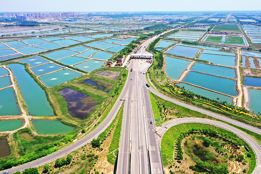 唐山至曹妃甸生態(tài)廊道曹妃甸段,苗木的翠綠和稻塘的蔚藍相互交錯,構(gòu)成一幅優(yōu)美和諧的生態(tài)畫卷。