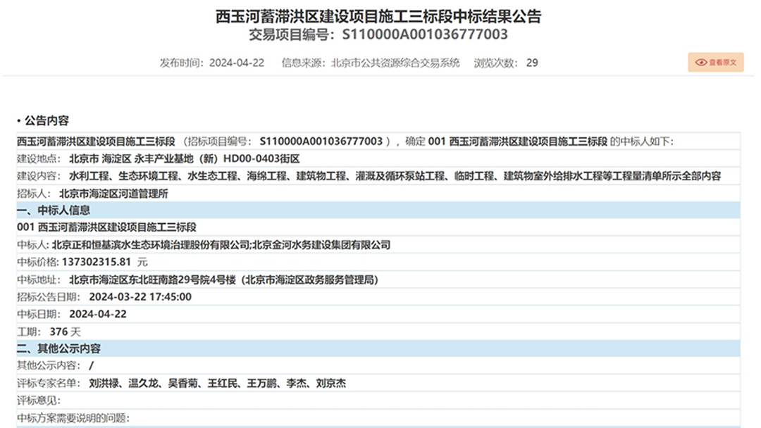 2024年4月22日,正和生態(tài)與北京金河水務(wù)集團(tuán)聯(lián)合體成功中標(biāo)海淀區(qū)西玉河蓄滯洪區(qū)建設(shè)項目(三標(biāo)段)(以下簡稱“本項目”),中標(biāo)金額1.37億元,此次中標(biāo)標(biāo)志著公司在北京地區(qū)水利業(yè)務(wù)布局實現(xiàn)了重要突破,展現(xiàn)了公司 “水利安全+生態(tài)系統(tǒng)構(gòu)建+智慧水務(wù)”一體化解決方案的核心競爭力。